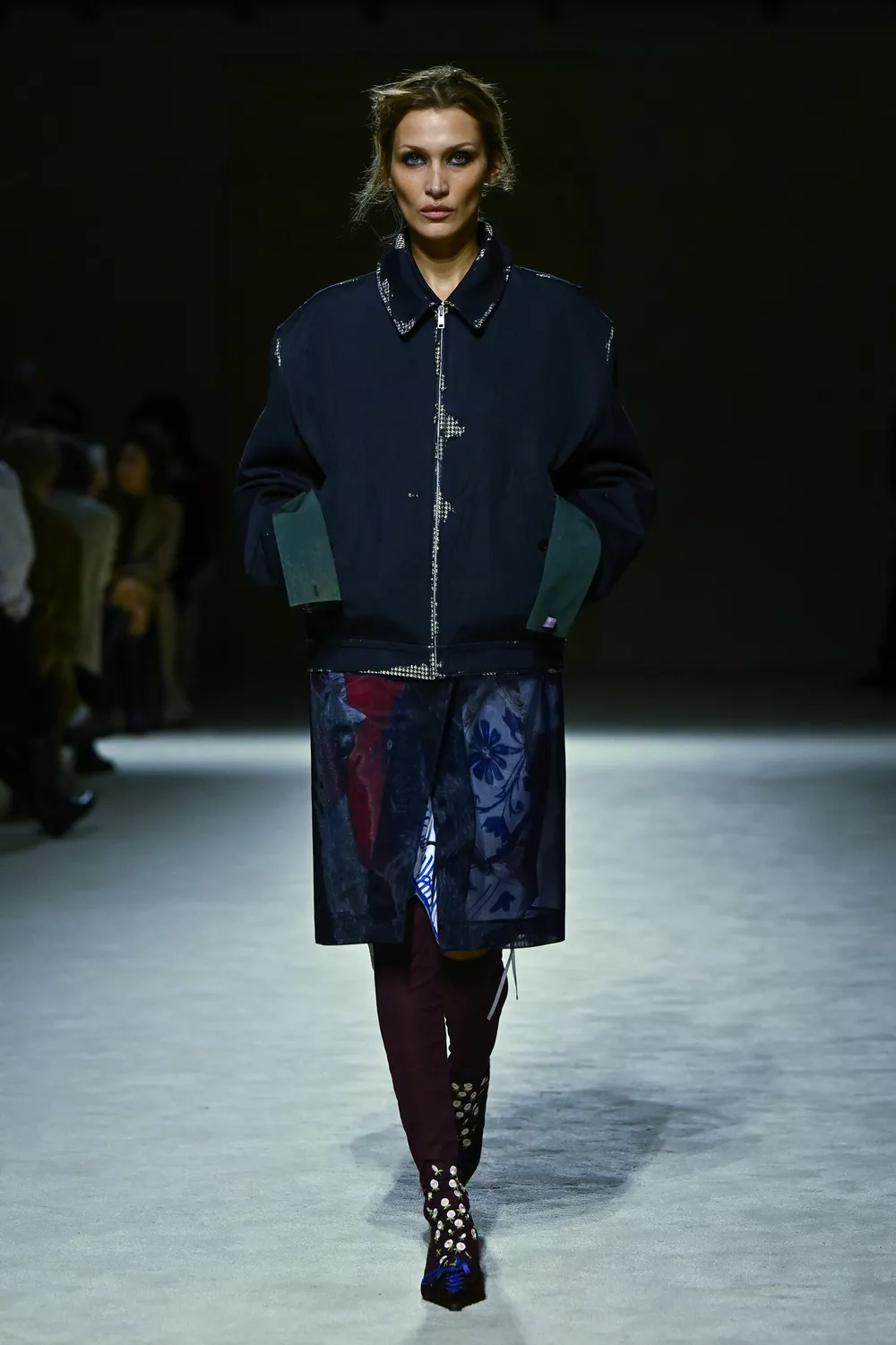 Все образы, которые продемонстрировала на себе Белла, можно считать настоящим мастер-классом по созданию многослойности. Сначала она появилась в полупрозрачной двухслойной синей юбке в сочетании с узорчатыми гольфами и просторным повседневным жакетом того же оттенка, а также синими лодочками на шнуровке. Для второго выхода Хадид примерила те же гольфы, лодочки и юбку, но сверху носила полупрозрачный многослойный тренч в глубоком сапфировом оттенке, а в руках держала миниатюрную синюю сумочку.