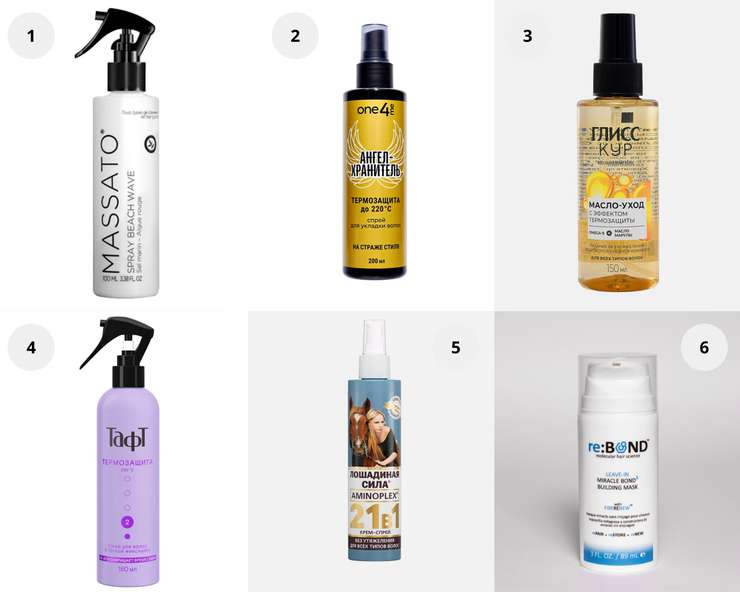 1. Термозащитный спрей-крем, Maria Nila. 2. Спрей с кератином для волос, Mono. 3. Спрей для волос 15 в 1 для расчесывания и термозащиты, Селенцин. 4. Термозащитный спрей для волос Heat-protective styling spray, MONE Professional 5. Липидная маска уплотняющая для придания объема волосам с трепангом, HydroBionique. 6. Спрей для волос Silk Extensions Spray SiliGY Glow & Easy Brushing, BB|One.