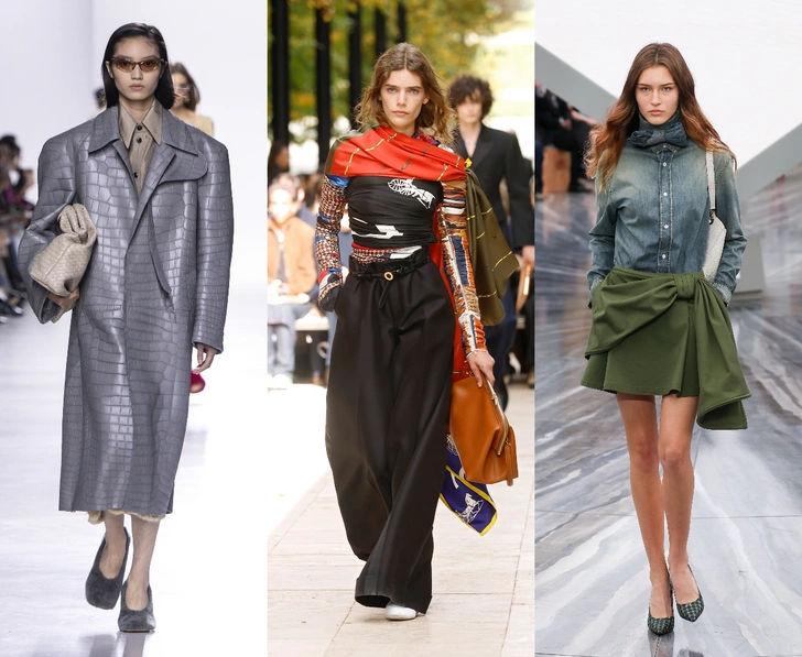 У Tom Ford — яблочно-зеленые и бордовые тренчи, которые задают настроение, без необходимости что-то «достраивать» снизу, у Celine и Bottega Veneta — расслабленные силуэты с намеком на загадочность: плащи, под которыми и вправду не видно, что именно надето. Стиль, построенный на недосказанности, оказался куда соблазнительнее прямых отсылок.
