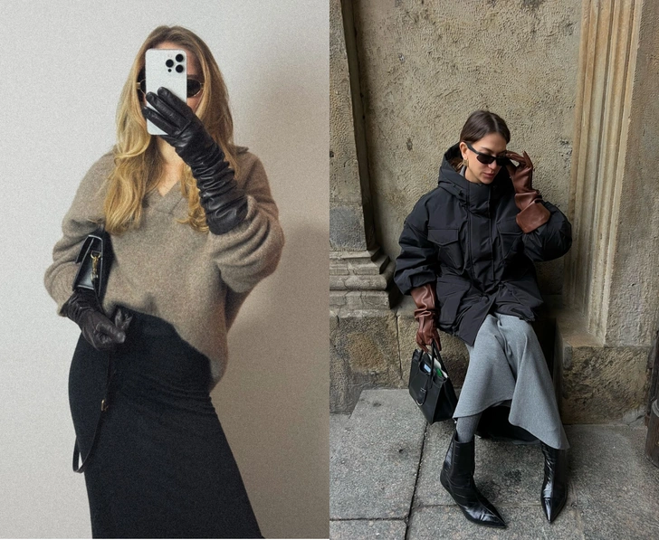 Экстра-длинные кожаные перчатки этой зимой окончательно перестали быть исключительно вечерним аксессуаром и вернулись в гардероб как полноценный стилистический прием. Их уже активно носят модные инфлюенсеры и селебрити: сочетают с пальто-халатами, оверсайз-плащами, трикотажными свитерами и даже с пуховиками. Эта маленькая деталь способна превратить повседневный аутфит в драматичный образ, добавляя внешности тот самый градус «староголливудской» женственности.