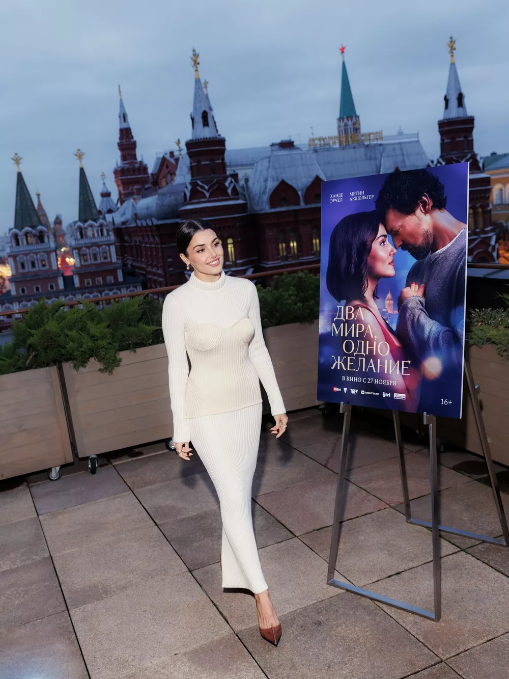 Наша встреча с Ханде проходит в отеле, где актриса остановилась на время пребывания в Москве. Вечером ее ждет громкая премьера фильма “Два мира, одно желание”, а пока мы беседуем о картине вместе с продюсерами Джемалом и Джаном Оканами. На Ханде – длинное вязаное платье светлого оттенка и коричневые туфли лодочки. Ее волосы собраны в гладкий низкий хвост. Эрчел улыбается и отвечает на вопросы очень добродушно, благодаря за вопросы.