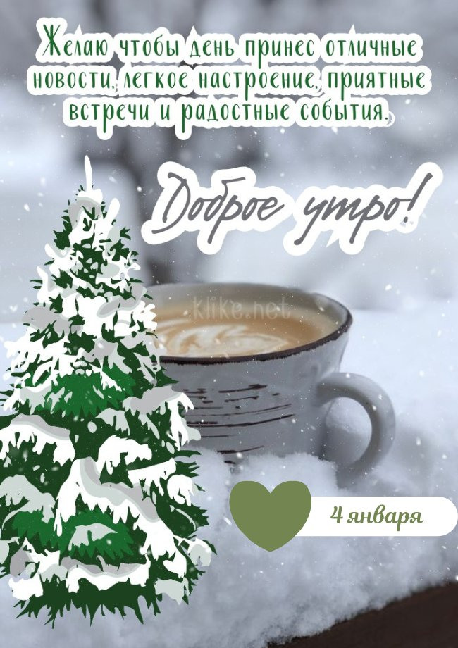 Потрясающая подборка — картинки и открытки доброе утро 4 января! Белые сугробы словно покрывало мягко укутывают всё вокруг, принося ощущение покоя. Пусть сегодняшний день будет щедрым на добрые эмоции, красивые мысли и искренние слова, сказанные от души.