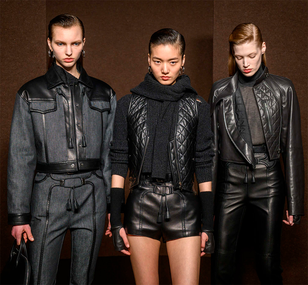 В коллекциях представлено богатство выбора, поэтому в сезоне 2025-2026 в моде любые предметы гардероба из кожи, от коротких шортов, топов и мини-юбок, до кожаных плащей длиной в пол и костюмов с юбкой или брюками.