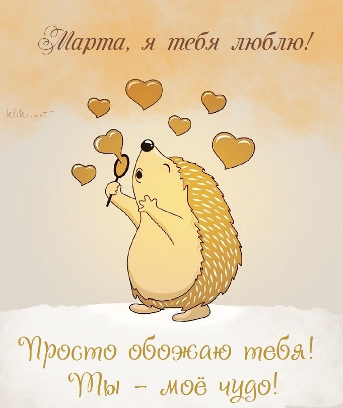 Успешная подборка — картинки и открытки я люблю тебя, Марта. Каждое послание – как лучик душевного тепла, передающего трепетные чувства к женщине, рядом с которой хочется стать лучше, стремиться к большему и не отпускать её ни на мгновение из мыслей и сердца. Милые слова Марте никогда не будут лишними.
