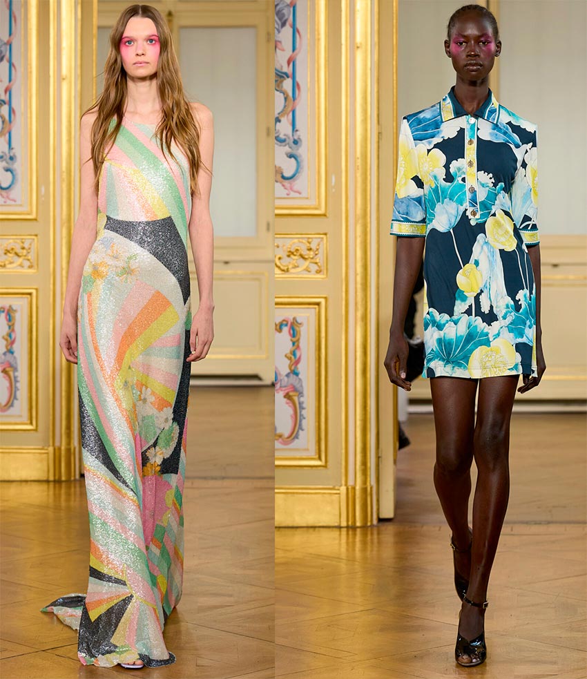 Струящиеся платья, объемные силуэты, преувеличенные пропорции, драпированные мини-юбки, платья-баллоны восхищают своей экстравагантностью. Гигантские цветы, напоминающие экзотические сады, доминируют на подиуме.