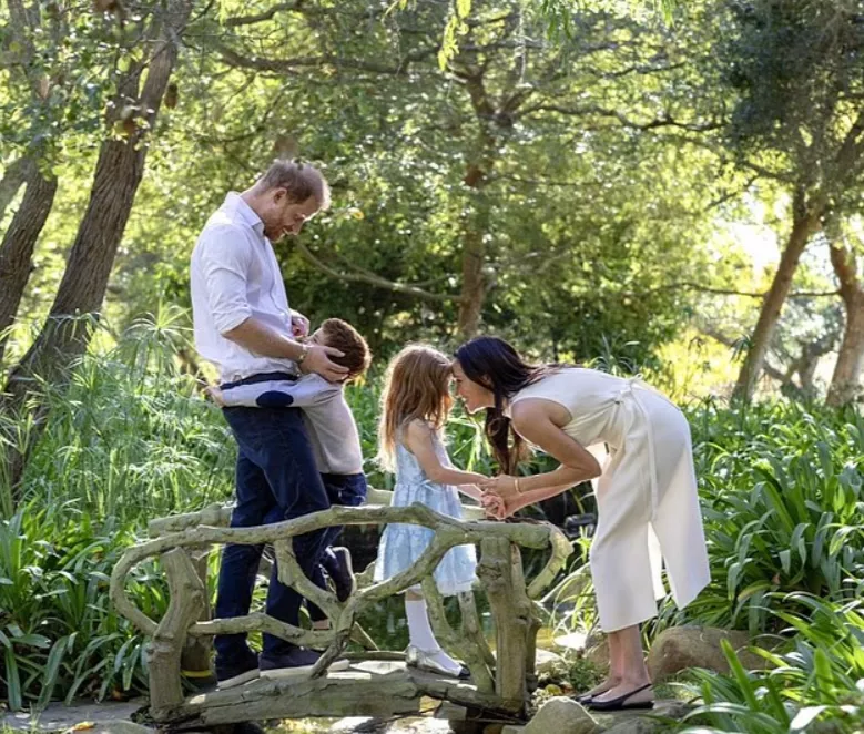 Спустя день после того, как Кейт Миддлтон и принц Уильям опубликовали трогательный семейный снимок — ежегодную открытку к грядущему католическому Рождеству, их примеру последовала и отлученные от королевской семьи родственники — Меган Маркл и принц Гарри. В отличие от прошлого года, супружеская чета Сассекских не стали ограничиваться дуэтным снимком, а задействовали для поздравительной открытки всю семью. На фото, которым Меган и Гарри поделились в соцсетях, они позируют с детьми на деревянном мостике в их саду в Монтесито.