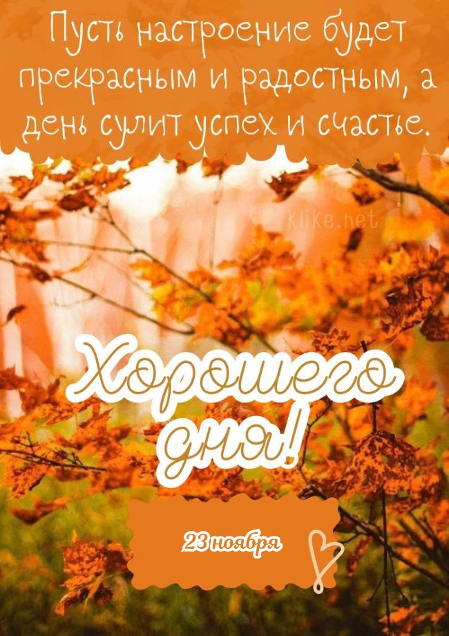 Фантастическая подборка — открытки и картинки на 23 ноября: неповторимые и первоклассные пожелания на утро, день, вечер и ночь. Шорох сухих листьев под ногами напоминает о быстротечности времени, но и о том, как важно замечать красоту в простом. Пусть каждый твой день будет наполнен уютными мгновениями, поддержкой и светлыми надеждами.