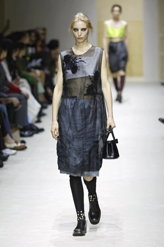 Первым делом в глаза бросаются «повидавшие виды» вещи: затертые куртки и плащи, мятые рубашки и юбки из органзы, проглядывающая из прорех разноцветная ткань. Последний прием, к слову, вдохновлен искусством. В живописи наслоенная друг на друга краска зовется pentimento — это знак того, что художник передумал в процессе работы и решил переписать часть картины. И Prada водружает поверх еще один уровень «несовершенности». Теперь из подиумных вещей нарочито торчат нитки, края тканей остаются необработанными, а дыры становятся полноценным декором.
