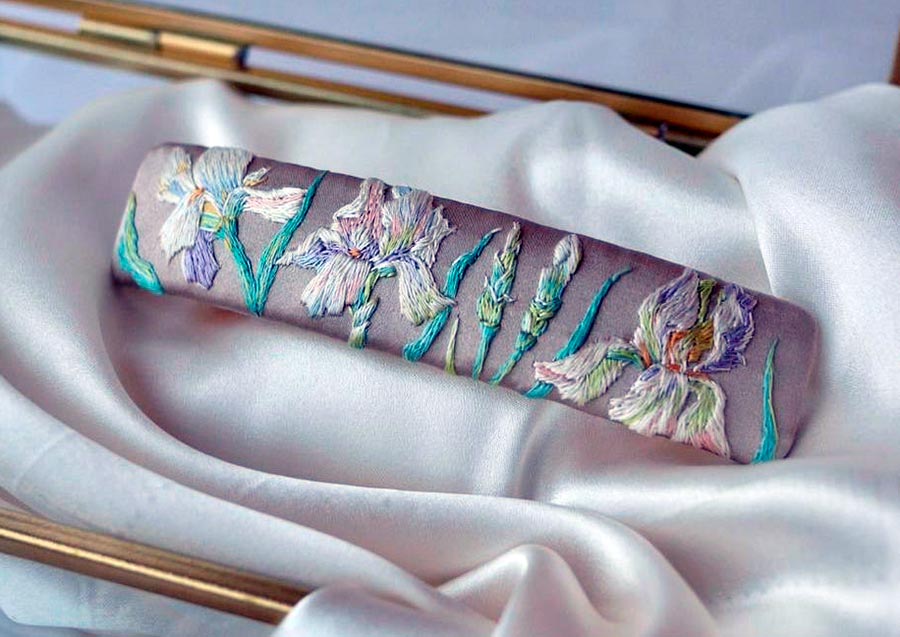 Изысканная заколка из благородного шелка бежевого оттенка станет настоящим акцентом в прическе. Её главная драгоценность — утонченная вышивка с ирисами, созданная коллекционными нитями нежных пастельных тонов. С изнаночной стороны аксессуар обшит мягкой натуральной кожей для максимального комфорта и долговечности.